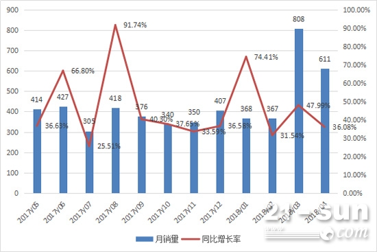 2018年4月份,納入統(tǒng)計的國內(nèi)主要平地機生產(chǎn)企業(yè)合計銷售平地機611臺,同比增長36%。611臺銷量也是歷史上4月份的最高銷量。據(jù)中國工程機械商貿(mào)網(wǎng)統(tǒng)計,今年以來,平地機銷量連續(xù)4個月創(chuàng)下歷史同期新高,自2017年2月以來,連續(xù)15個月增速超20%,行業(yè)增長勢頭十分強勁。