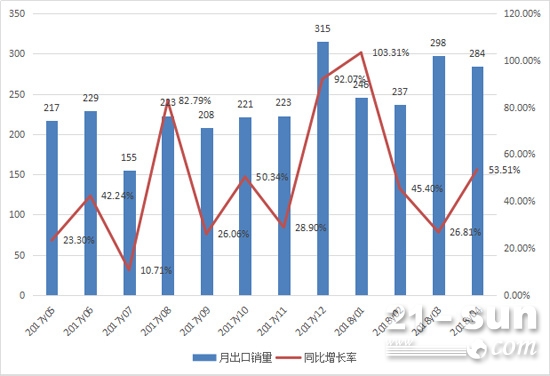 2018年以來,平地機累計出口1065臺,約占總銷量49%,同比增長51%。
