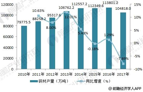 圖表3:2010-2017年中國鋼材產(chǎn)量及同比增長速度(單位:萬噸,%)