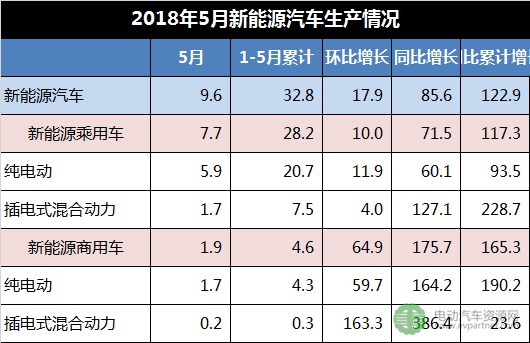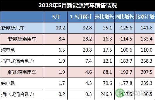 1-5月,新能源汽車產(chǎn)銷均完成32.8萬(wàn)輛,比上年同期分別增長(zhǎng)122.9%和141.6%。其中純電動(dòng)汽車產(chǎn)銷均完成25.0萬(wàn)輛,比上年同期分別增長(zhǎng)105.1%和124.7%;插電式混合動(dòng)力汽車產(chǎn)銷分別完成7.9萬(wàn)輛和7.8萬(wàn)輛,比上年同期分別增長(zhǎng)207.3%和218.4%。中汽協(xié)會(huì)秘書長(zhǎng)助理陳士華表示,根據(jù)目前市場(chǎng)情況預(yù)判,2018年產(chǎn)銷規(guī)模突破100萬(wàn)輛可期。