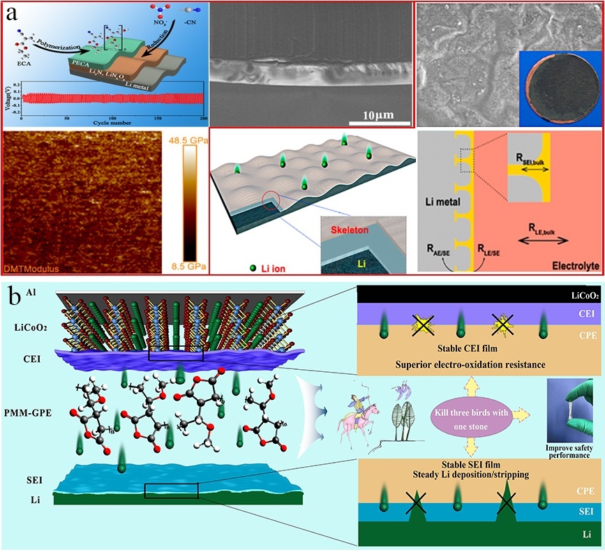 圖1(a)人工構(gòu)建有機(jī)/無(wú)機(jī)復(fù)合電解質(zhì)膜(SEI)修飾的高性能鋰金屬負(fù)極;(b)聚乙烯基甲醚-馬來(lái)酸酐多功能聚合物電解質(zhì)