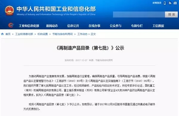 2017年《再制造產(chǎn)品目錄(第七批)》公示