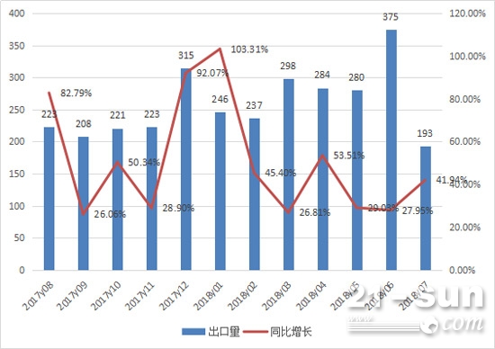 7月份平地機(jī)共出口193臺,繼續(xù)保持歷史同期新高;7月份出口銷量同比增長42%,占總銷量60%。