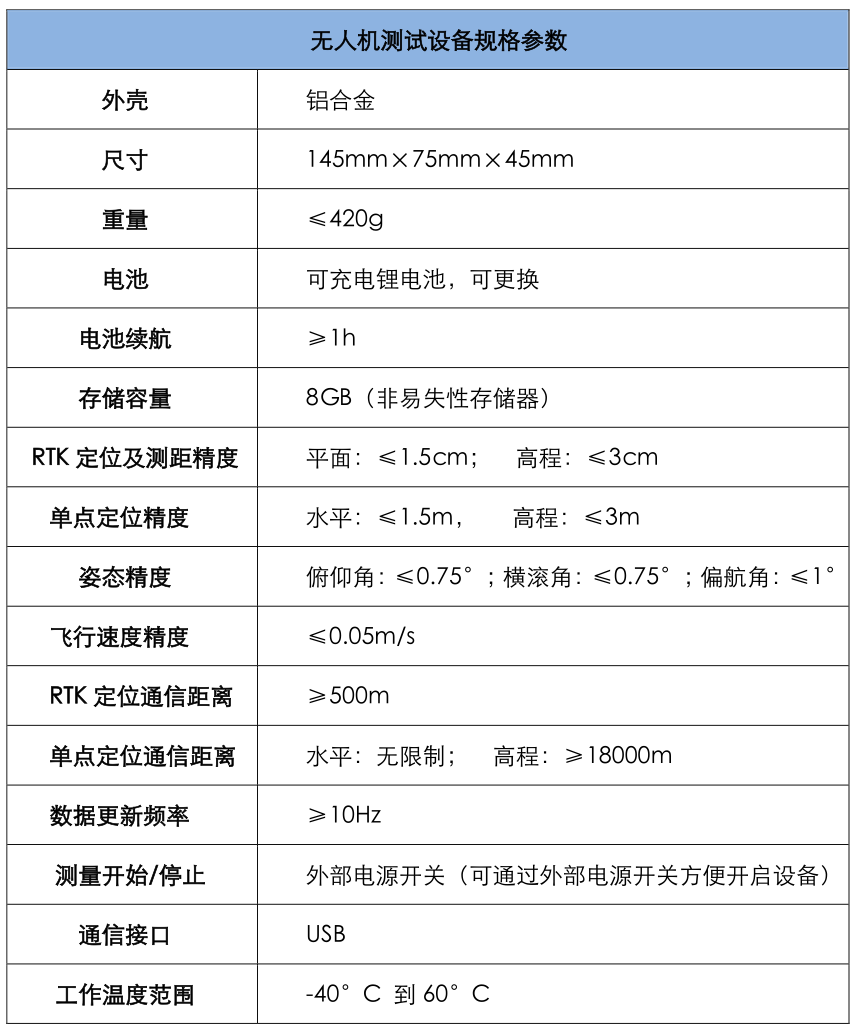 無人機測試設備自主供電,測試過程掛載在被測無人機上,對被測無人機的飛行參數(shù)進行采集、存儲。測試完成后,飛行數(shù)據(jù)通過usb導入無人機飛行性能測試軟件,進行分析和判讀。