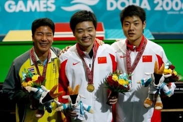 2006年多哈亞運會,丁俊暉成為臺球賽場的神話。四天時間里,參加斯諾克個人、雙打和團(tuán)體賽的丁俊暉竟然打了15場比賽,體力消耗逼近極限?!吧衿嫘∽印毕群吞稆i飛搭檔奪得雙打冠軍。接著,丁俊暉、田鵬飛與梁文博合力戰(zhàn)勝中國香港隊,報了釜山的一劍之仇。最后的男單決賽成為“中國德比”,丁俊暉戰(zhàn)勝梁文博,包攬三金,完成亞運斯諾克比賽的大滿貫。中國隊在臺球項目取得3金1銀2銅,金牌榜和獎牌榜雙雙登頂。