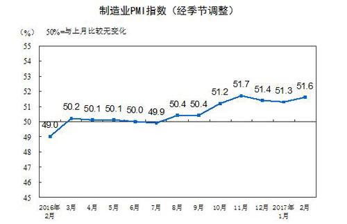 國家統(tǒng)計局在3月1日發(fā)布了2017年2月中國制造業(yè)PMI指數(shù)。數(shù)據(jù)顯示2月份我國制造業(yè)PMI指數(shù)為51.6%,比上月上升0.3%??梢钥闯?,我國制造業(yè)發(fā)展持續(xù)向穩(wěn)、整體態(tài)勢趨于積極。