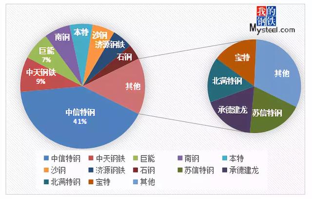 從下圖可以看出,目前軸承鋼產(chǎn)量較大的分別是:中信特鋼(新冶鋼、興澄特鋼、青島鋼鐵)、中天和巨能,占到總產(chǎn)量的57%。