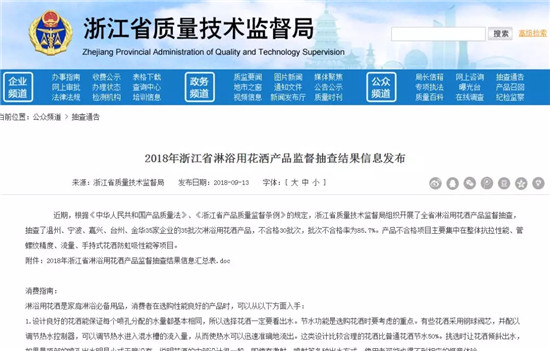9月13日,浙江省質(zhì)量技術(shù)監(jiān)督局官網(wǎng)發(fā)布“2018年浙江省淋浴用花灑產(chǎn)品監(jiān)督抽查結(jié)果”,本次共抽查了溫州、寧波、嘉興、臺州、金華35家企業(yè)的35批次淋浴用花灑產(chǎn)品,不合格30批次,批次不合格率為85.7%。