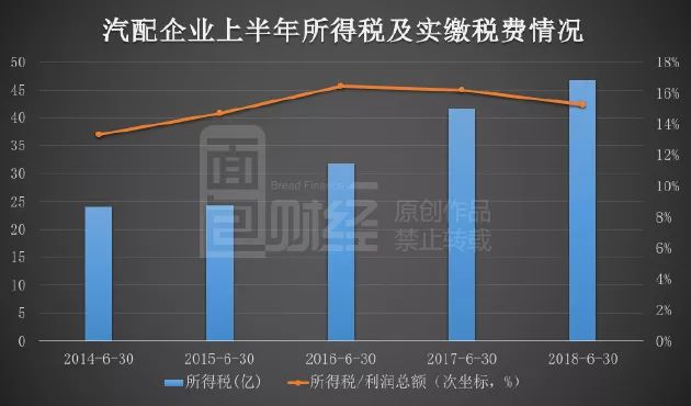 從2014H1-2018H1這五年的數(shù)據(jù)來看,汽配行業(yè)的利潤總額一度在2015H1有所下滑,5年利潤累計增長約70.74%。