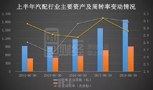 事實上,自2015H1-2018H1,汽配行業(yè)應(yīng)收賬款、應(yīng)收票據(jù)和存貨的規(guī)模持續(xù)上升,應(yīng)收賬款及票據(jù)由915.31億增至1886.66億,累計增長106.12%,高于同期營收增速;存貨由508.31億增至909.84億,累計增長78.99%。