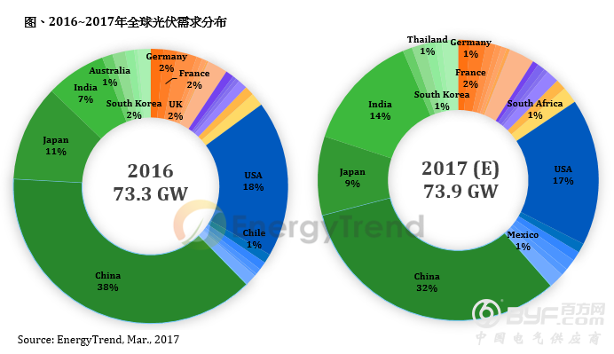 EnergyTrend分析師蔡旻純表示,由于中國目前公布之2017年光伏裝機(jī)目標(biāo)略低于去年,加上美國政策恐不利于光伏發(fā)展、日本躉購費(fèi)率(Feed-in-Tariff)持續(xù)下調(diào)等因素,讓需求強(qiáng)勁成長中的印度有望取代日本成為需求第三大國,占全球比重達(dá)14%。