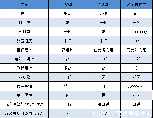 眾所周知、在大屏幕顯示市場上除了液晶拼接屏外還有著LED以及DLP等顯示設(shè)備。而不同類型的顯示設(shè)備之間因為使用的技術(shù)不一樣導(dǎo)致其在顯示效果方面或多或少的存在著一定的差異。然而顯示效果又是用戶選擇大屏幕顯示設(shè)備的重要參考依據(jù),為此深圳保誠顯示技術(shù)有限公司就其顯示效果的優(yōu)劣差異做了一下對比分析:
