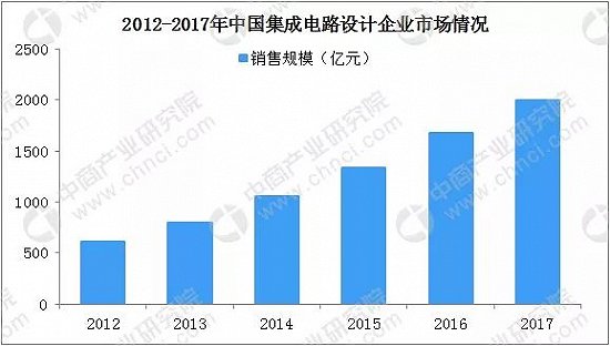 在此背景下,我國集成電路產(chǎn)業(yè)實現(xiàn)了快速發(fā)展,產(chǎn)業(yè)規(guī)模從2012年的2159億元提升至2017年的5411億元,年復(fù)合增長率達(dá)到22.9%,預(yù)計2018年產(chǎn)業(yè)規(guī)模將達(dá)到5740億元。技術(shù)水平顯著提升,有力推動了國家信息化建設(shè)。