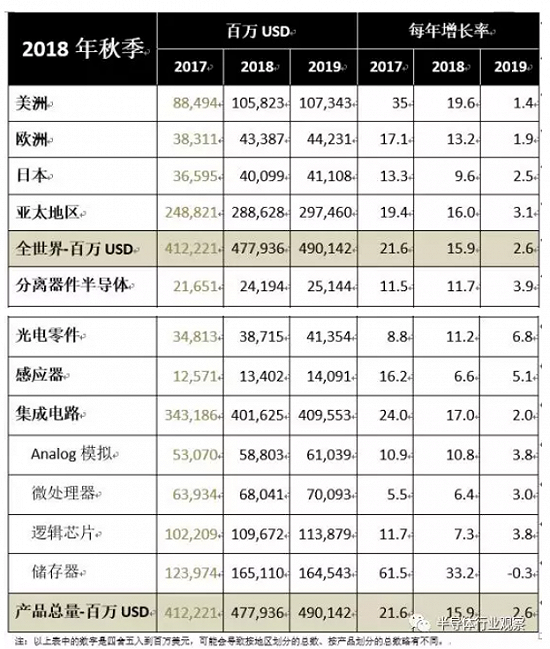 按照他們的預(yù)測(cè)顯示,2018年全球半導(dǎo)體市場(chǎng)規(guī)模增加到4,780億USD,2019年增加到4,900億USD。其中2018年比去年同期增長(zhǎng)15.9%。以上數(shù)字反應(yīng)了主要領(lǐng)域的情況:Memory(內(nèi)存)增長(zhǎng)率為33.2%,其次是Discretes(分離器件)為11.7%,最后光電零件為11.2%。2018年預(yù)測(cè)所有的地區(qū)都是如預(yù)期一樣增長(zhǎng)。