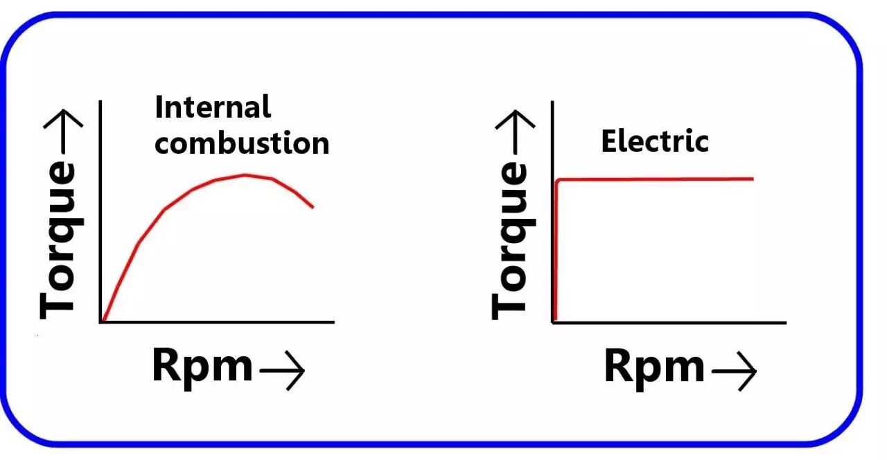 電動感應馬達一通電,馬上就可以產(chǎn)生扭矩和推力, 而且無需換擋。汽車的引擎打著火以后,需要從低檔一步步換到高檔,逐漸提高轉速才能提高扭矩和推力。這就是為什么電車加速普遍比汽車快的根本原因。這也是為什么開過電車的人,幾乎都不愿意再回去開汽車. 如下圖.