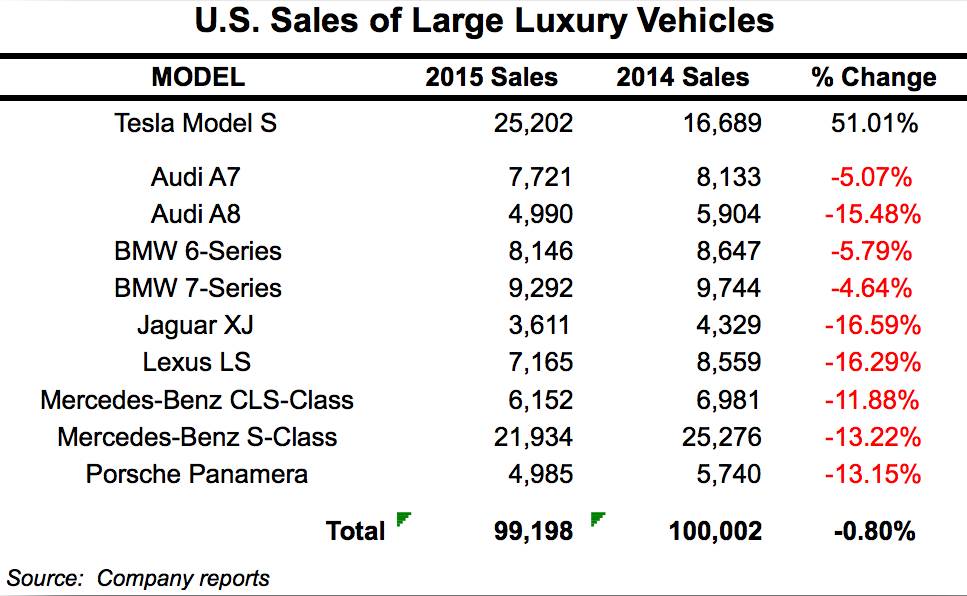 特斯拉的 model s 2015年,已經(jīng)在美國大型豪華轎車的市場份額中占到 25%,如上圖。同期其它車型的銷量普遍比 2014年下降 10%以上。