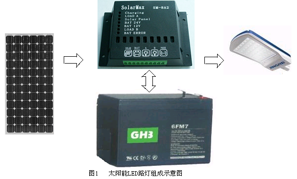 太陽能LED路燈利用太陽電池的光生伏特效應(yīng)原理,白天太陽能電池吸收太陽能光子能量產(chǎn)生電能,通過光伏控制器的控制將電能儲存在蓄電池中,當(dāng)夜幕降臨或燈具周圍光照度較低時,蓄電池中存儲的電能通過光伏控制器的控制為光源供電,設(shè)定的時間到后控制器切斷光源電源。太陽能LED路燈由以下幾個部分組成:太陽能電池板、太陽能LED路燈控制器、蓄電池組、光源、燈桿及燈具外殼等幾部分組成,如圖1所示。