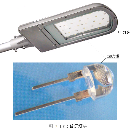 由于LED的工作電流是直流,且工作電壓較低。太陽電池將光能轉(zhuǎn)化為直流電能,且太陽電池組件可以通過串并聯(lián)方式組合得到實際需要的電壓。這些特點恰好與LED相匹配,兩者結(jié)合將獲得很高的能源利用率、較高的安全性能和可靠性,實現(xiàn)節(jié)能、環(huán)保、安全、高效的照明系統(tǒng),實現(xiàn)十分完美的結(jié)合。LED路燈燈頭如圖2所示。