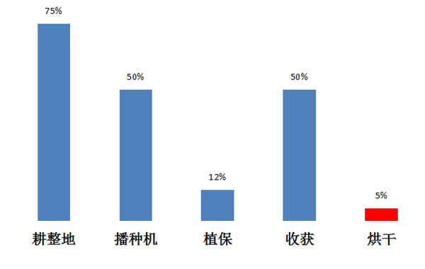 先看第一個(gè)指標(biāo)。從下圖可以看出來(lái),糧食種植三個(gè)關(guān)鍵環(huán)節(jié)中,糧食烘干機(jī)的確是短板中的短板,當(dāng)然對(duì)于5%這個(gè)數(shù)據(jù),有的人并不認(rèn)可,認(rèn)為10%比較合適,但筆者認(rèn)為是5%或10%并不重要,重要的是我們要知道我們國(guó)家糧食烘干水平確實(shí)很低,亟待迎頭趕上。
