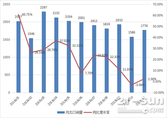 今年以來,裝載機(jī)各月出口銷量均在1500臺以上,11月出口量為1776臺,占總銷量10.2%,同比微增2.4%。