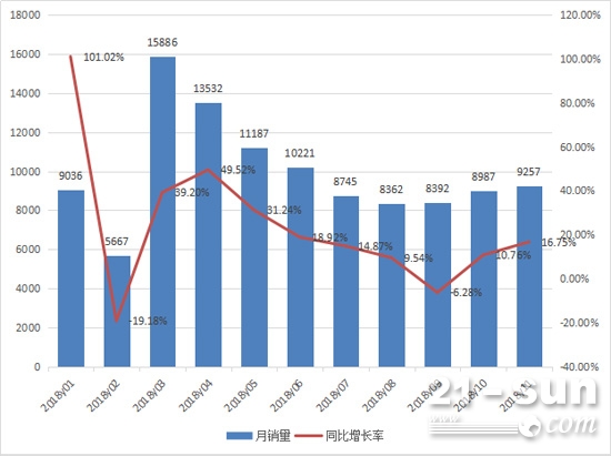 在9月份同比小幅下滑后,裝載機(jī)在接下來的兩個(gè)月里重回上升通道。2018年11月,納入統(tǒng)計(jì)的25家裝載機(jī)生產(chǎn)企業(yè)合計(jì)銷售各型號裝載機(jī)9257臺,同比增長16.75%;今年以來,裝載機(jī)累計(jì)銷量達(dá)到10.9萬臺,同比增長22.3%,前11月銷量已超2017全年。