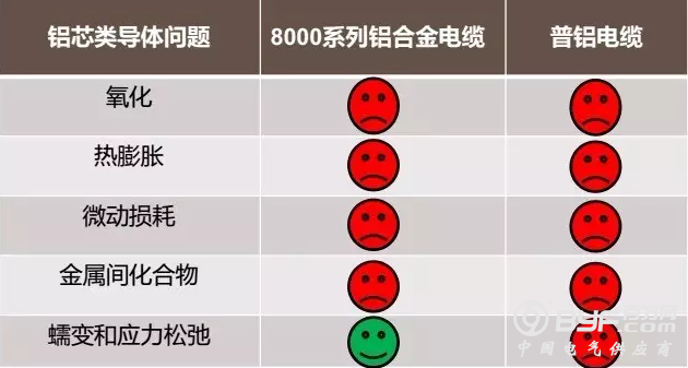 GB/T19292.2-2003標(biāo)準(zhǔn)表1注4中說(shuō)明:鋁合金耐腐蝕性差于普鋁更差于銅,這是因?yàn)殇X合金電纜加入了鎂、銅、鋅、鐵元素,因此易于發(fā)生局部腐蝕如應(yīng)力腐蝕斷裂、層蝕、晶間腐蝕,而且8000系列鋁合金屬于易腐蝕配方,鋁合金電纜增加了熱處理工序,易造成物理狀態(tài)不均勻,比鋁電纜更容易被腐蝕。目前在我國(guó)應(yīng)用的鋁合金基本都是8000鋁合金系列。