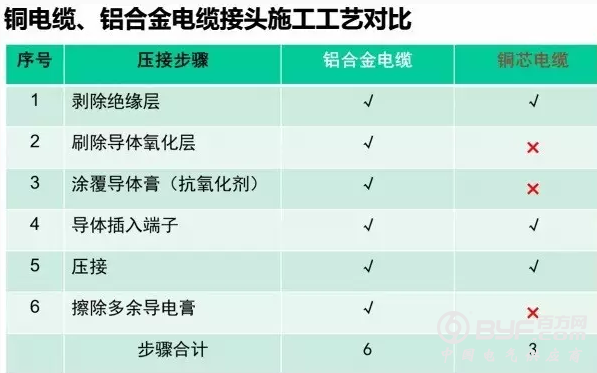鋁合金電纜接頭工藝比銅電纜多出三個(gè)工藝,氧化層的有效去除和涂覆抗氧化劑是關(guān)鍵,國(guó)內(nèi)施工水平,質(zhì)量要求參差不齊,留有隱患。而且由于國(guó)內(nèi)沒(méi)有嚴(yán)格法律責(zé)任賠償體系,最終損失后果實(shí)踐中基本還是用戶自己承擔(dān)。