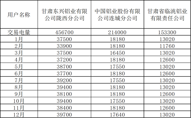 近日,甘肅省電力交易中心發(fā)布2018年度電解鋁與發(fā)電企業(yè)直接交易公告,公告顯示,2019年甘肅東興鋁業(yè)有限公司隴西分公司交易電量為456700萬千瓦時;中國鋁業(yè)股份有限公司連城分公司交易電量214000萬千瓦時;甘肅省臨洮鋁業(yè)有限責(zé)任公司交易電量153300萬千瓦時;三家企業(yè)合計交易電量共824000萬千瓦時,按噸鋁耗電13500千瓦時核算,交易電量對應(yīng)61萬噸電解鋁產(chǎn)能。