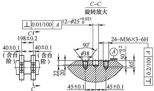 (1)圖樣分析。圖樣要求在曲軸安裝面上加工M36×3—6H、鉆深65mm、攻深50mm的螺紋孔,并在孔口倒夾角為90°的角,要求螺紋孔的中心線與安裝面的垂直度在0.002mm以內(nèi),加工φ25+0.021 +0mm的銷子孔,銷子孔鉆深22mm、鏜深20mm,要求銷子孔的中心線與安裝面的垂直度在0.000 1mm以內(nèi),其安裝面上的孔與平衡塊上的孔是通過定位銷和螺栓聯(lián)接相互配合裝配的,某曲軸安裝面孔的結(jié)構(gòu)尺寸如圖1所示。