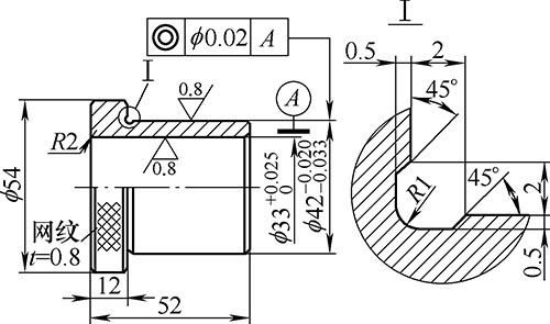 在鉸孔過程中,為了保證鉸孔的加工精度,也制作了鉸套(見圖4)。在鉸孔過程經(jīng)常出現(xiàn)孔徑超差、內(nèi)孔不圓、鉸孔后孔的中心線不直、孔表面粗糙度值無法滿足要求等現(xiàn)象,通過改變鉸刀的大小、鉸孔的余量、鉸刀的轉(zhuǎn)速和進(jìn)給速度等多種方法都無法避免此問題的產(chǎn)生,為此設(shè)計(jì)了安裝面鉆模并配套設(shè)計(jì)了φ33+0.025 +0mm鉸套和φ32.9mm的鉸刀間隙配合。經(jīng)過多個(gè)孔的試切削加工,孔的精度都相當(dāng)高,而且鉸孔余量也減少了,提高了加工效率。