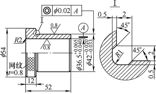 攻螺紋一直以來都是加工中最困難的一類工序。攻螺紋時(shí),絲錐幾乎是被埋在工件中進(jìn)行切削的,絲錐沿著螺紋與工件接觸面積大,加工后螺紋孔容易出現(xiàn)爛牙、通規(guī)通不過以及止規(guī)止不住等問題。除此之外,鉆床主軸為柔性,在攻螺紋過程中主軸隨意擺動(dòng),尤其是絲錐剛切入時(shí),擺動(dòng)現(xiàn)象最為嚴(yán)重,攻出的螺紋無法達(dá)到要求,采取多種措施都無法避免問題的再發(fā)生。經(jīng)過設(shè)計(jì)鉆模和攻螺紋套,攻螺紋過程中出現(xiàn)的問題都基本解決了。攻螺紋套具體結(jié)構(gòu)尺寸如圖5所示。