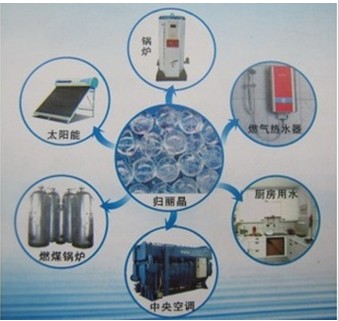 硅磷晶(歸麗晶、歸麗精、潔靈精)的主要成分在水中有效地抑制和干擾了碳酸鈣晶體的正常生長,控制了晶核形成的速度,使之不能沉積形成水垢;在此作用的同時,對已形成并附著管內(nèi)壁上鈣、鎂、鐵產(chǎn)生絡合或螯合反應,然后借助布朗運動或水流作用,達到最終的分散效力。
