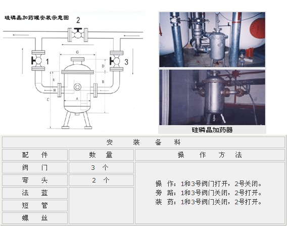 ③.硅磷晶罐安裝形式應(yīng)為旁通式安裝,以滿足在不停機(jī)狀態(tài)下加裝硅磷晶藥劑的需要。