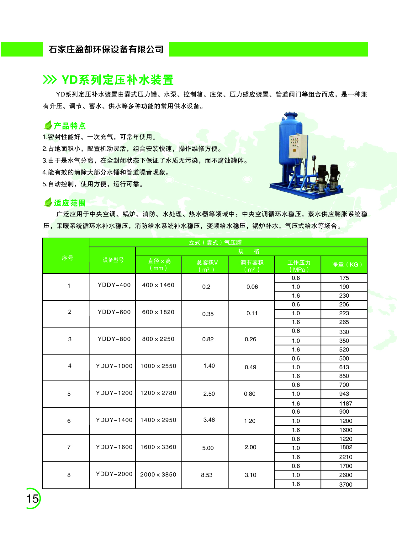 遷安定壓供水罐廣泛應(yīng)用于住宅小區(qū)、工廠、商業(yè)、旅游、醫(yī)院、軍事設(shè)施等多層或高層建筑的生活供水、消防供水。用于暖氣供水系統(tǒng),應(yīng)用定壓補(bǔ)水機(jī)組無(wú)需設(shè)置屋頂?shù)呐蛎浰洹?