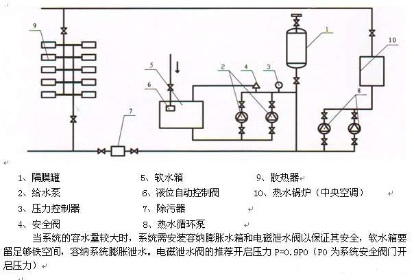 該設(shè)備采用系統(tǒng)靜壓作為膨脹水箱內(nèi)的設(shè)計初始壓力水頭,采用保證系統(tǒng)內(nèi)熱水不汽化的壓力作為膨脹水箱內(nèi)動行終端壓力水頭。初始運行時首先啟動補(bǔ)水泵向系統(tǒng)及氣壓罐內(nèi)的水室中充水,系統(tǒng)充滿后多余的水被擠進(jìn)膠囊內(nèi)。因為水的不可壓縮性,隨著水量的不斷增加,水室的體積也不斷的擴(kuò)大而壓縮氣室,罐內(nèi)的壓力也不斷的升高。當(dāng)壓力達(dá)到設(shè)計壓力時,通過壓力控制器使補(bǔ)水泵關(guān)閉。當(dāng)系統(tǒng)內(nèi)的水受熱膨脹使系統(tǒng)壓力升高超過設(shè)計壓力時,多余的水通過安全閥排至補(bǔ)水箱循環(huán)使用,當(dāng)系統(tǒng)中的水由于泄露或溫度下降而體積縮小,系統(tǒng)壓力降低時,膠囊中的水被不斷壓入管網(wǎng)補(bǔ)充系統(tǒng)的壓降損失,當(dāng)系統(tǒng)壓力至設(shè)計允許的最低壓力時,通過壓力控制器使補(bǔ)水泵重新啟動向管網(wǎng)及氣壓罐內(nèi)補(bǔ)水,如此周而復(fù)始 .