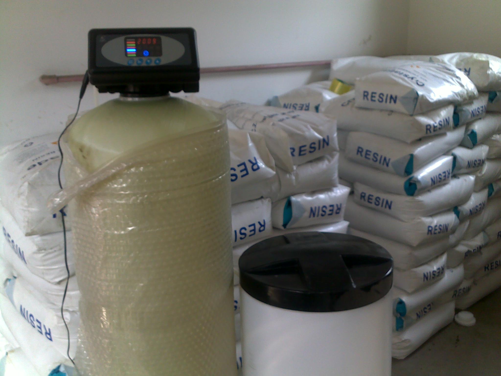 由于水的硬度主要由鈣、鎂形成及表示,故一般采用陽離子交換樹脂(軟水器),將水中的Ca2+、Mg2+(形成水垢的主要成份)置換出來,隨著樹脂內(nèi)Ca2+、Mg2+的增加,樹脂去除Ca2+、Mg2+的效能逐漸降低。當(dāng)樹脂吸收一定量的鈣鎂離子之后,就必須進(jìn)行再生,再生過程就是用鹽箱中的食鹽水沖洗樹脂層,把樹脂上的硬度離子在置換出來,隨再生廢液排出罐外,樹脂就又恢復(fù)了軟化交換功能。