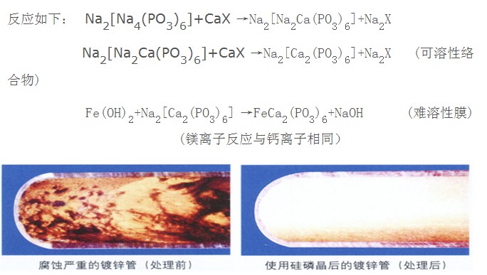 硅磷晶是一種新的水處理高科技產(chǎn)品,是由硅酸鹽和磷酸鹽經(jīng)高溫熔融聚合的玻璃狀聚合體,只需在水管內(nèi)添加微量該緩蝕阻垢劑,就可以徹底地防止腐蝕和水垢的生成。在水中硅磷酸鹽系飲用水處理劑濃度約 3-5ppM 時,形成可溶性絡(luò)合物和難溶性納米級膜來起阻垢和防腐作用,有效防止二次污染。