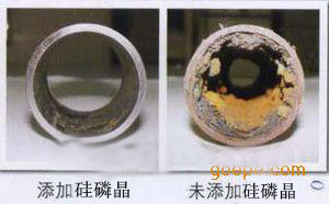 3 .硅磷晶可在鋼管和銅管等各種金屬內形成保護膜,防止腐蝕。 防腐作用:微量的硅磷晶中 p-p 成份,隔絕了水中溶解氧與金屬離子的化反應,阻止了氫氧化亞鐵繼續(xù)反應生成氫氧化鐵,即鈍化作用,在水管內壁生成一種無定形的能自動修復的保護膜( 1um ) , 這層具有強親和力的分子膜阻當了水中溶解氧的腐蝕,從而抑制了整個腐蝕的過程。