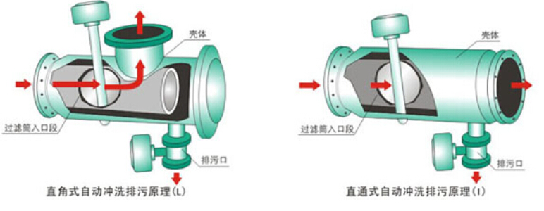 全自動(dòng)反沖洗過濾器主要有優(yōu)質(zhì)碳鋼筒體,特殊結(jié)構(gòu)的不銹鋼契形濾網(wǎng),蝶閥及排污裝置所組成。當(dāng)過濾器工作時(shí),蝶閥處于開啟狀態(tài),水流由入口進(jìn)入過濾器,經(jīng)過濾網(wǎng)過濾到出口。當(dāng)過濾器需要排污時(shí),關(guān)閉蝶閥,打開排污閥,水流經(jīng)濾網(wǎng)前半段過濾,部分水流有出口流入系統(tǒng),剩余水流由濾網(wǎng)后半段外側(cè)流入內(nèi)側(cè),經(jīng)排污口排出,起到反向自動(dòng)沖洗濾網(wǎng)的作用。整個(gè)沖洗過程系統(tǒng)可正常工作,無(wú)需停機(jī)。