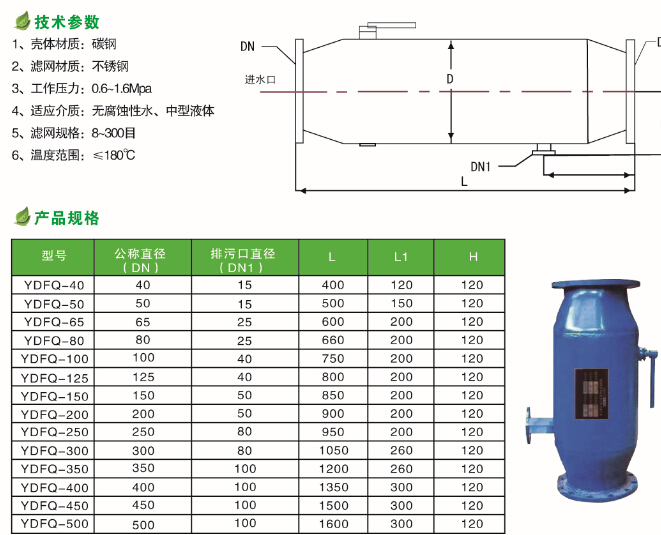 YD系列巴彥淖爾反沖洗除污器 主要由優(yōu)質碳鋼筒體、特殊結構的不銹鋼楔形濾網、水流導向閥及排污裝置所組成。當過濾器工作時,水流導向閥處于開啟狀態(tài),水流由入口進入過濾器,經過濾網過濾到出口。當過濾器需要排污時,關閉水流導向閥,打開排污閥,水流經濾網前半段過濾,部分水流由出口流入系統(tǒng),剩余水流由濾網后半段外側流入內側,經排污口排出,起到反向自動沖洗濾網的作用。這樣整個沖洗過程系統(tǒng)可正常運行,無需停機。