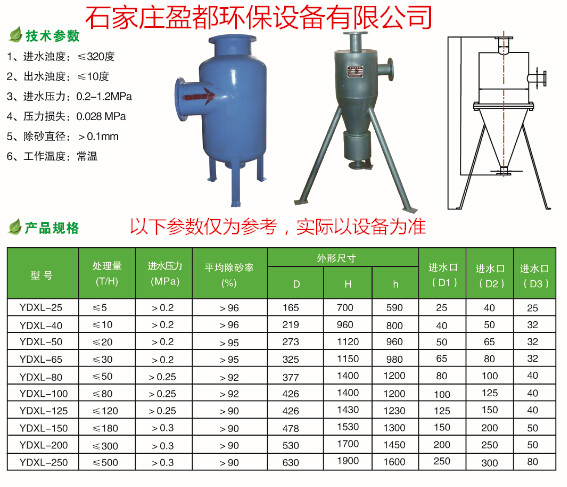 選型注意事項旋流除砂器選型須考慮處理水量,外部接管管徑,管道工作壓力,原水品質以及處理后水質要求等因素。一般情況下,選用旋流除砂器時,在滿足流量的前提下,優(yōu)先選用大的型號設備,并推薦在系統(tǒng)中用幾臺設備并聯替代大設備,以便取得更佳的固液分離效果。