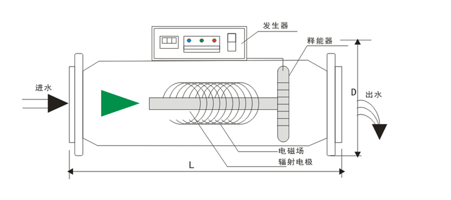 同時(shí),當(dāng)水流經(jīng)高壓、高頻電磁場(chǎng)時(shí),水中的重碳酸鹽中的鈣、鎂離子和各重碳酸根離子會(huì)在高壓、高頻電磁場(chǎng)的作用下,失去化學(xué)性、物理性和相互吸引的能力,逐漸形成晶體團(tuán)沉入底部,隨排污排出,從而達(dá)到防垢的目的。
