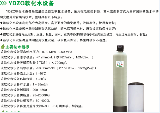 1、設(shè)備運行周期和進鹽量可根據(jù)原水硬度的高低選擇調(diào)整,樹脂用量少,耗鹽低,水質(zhì)優(yōu),操作簡單,維護方便.