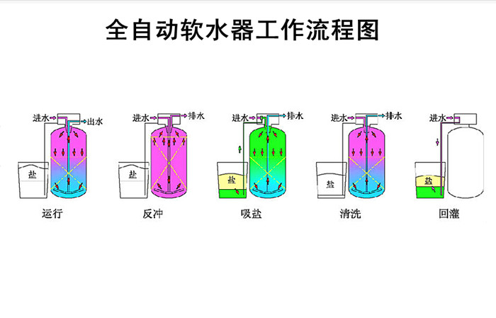 工作(有時(shí)叫做產(chǎn)水,下同)、反洗、吸鹽(再生)、慢沖洗(置換)、快沖洗五個(gè)過(guò)程。不同軟化水設(shè)備的所有工序非常接 近,只是由于實(shí)際工藝的不同或控制的需要,可能會(huì)有一些附加的流程。任何以鈉離子交換為基礎(chǔ)的軟化水設(shè)備都是在這五個(gè)流程的基礎(chǔ)上發(fā)展來(lái)的(其中,全自動(dòng)軟化水設(shè)備會(huì)增加鹽水重注過(guò)程)。