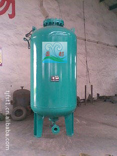 囊式膨脹定壓罐主要由鋼制罐體、供水膠囊、進(出)水口、充氣裝置、壓力表、排氣閥等組成。供水膠囊采用純天然無毒橡膠制成,具有良好的韌性和伸縮性能,它與進水口相通,并且形成一個密閉的腔室將水與外部鋼罐內(nèi)壁完全隔絕,膠囊和鋼罐內(nèi)壁之間充有氮氣,具有很強的化學惰性及比熱容大等優(yōu)點。囊式定壓罐主要利用氣體的可壓縮性,對系統(tǒng)由于溫度變化引起的水體積增大或減少進行吸納或補充作用。當系統(tǒng)溫度增高時,水體積增大,這時系統(tǒng)壓力大于罐內(nèi)氣體壓力,部分水會被壓入罐內(nèi)的膠囊里,直到罐內(nèi)氣體的壓力與系統(tǒng)壓力達到平衡。當系統(tǒng)溫度降低時,水體積變小,這時罐內(nèi)氣體壓力大于系統(tǒng)壓力,部分水會被壓回系統(tǒng),起到對系統(tǒng)補充水量的作用。囊式定壓罐通常與外部的控制箱,補水泵及電接點壓力表等,連接形成機組,根據(jù)系統(tǒng)的最低需要壓力及最高運行工作壓力設(shè)定工作狀態(tài)。