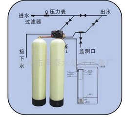 由于水的硬度主要由鈣、鎂形成及表示,故一般采用陽離子交換樹脂(軟水器),將水中的Ca2+、Mg2+(形成水垢的主要成份)置換出來,隨著樹脂內(nèi)Ca2+、Mg2+的增加,樹脂去除Ca2+、Mg2+的效能逐漸降低。當樹脂吸收一定量的鈣鎂離子之后,就必須進行再生,再生過程就是用鹽箱中的食鹽水沖洗樹脂層,把樹脂上的硬度離子在置換出來,隨再生廢液排出罐外,樹脂就又恢復(fù)了軟化交換功能。