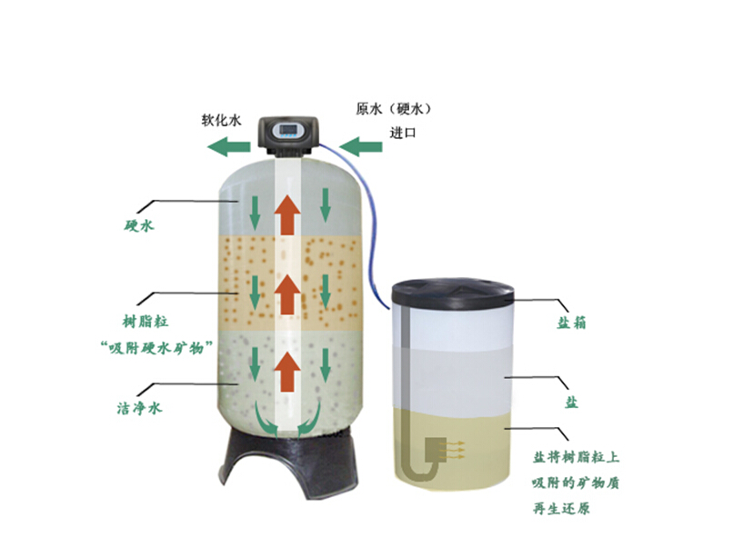 含有鈣、鎂離子濃度較高的自來水通過離子交換劑層,鈣、鎂離子被交換劑所吸附,并將交換劑中的鈉離子置換于水中,從而使硬度較高的自來水交換變成軟化水,化學(xué)反應(yīng)式如下: