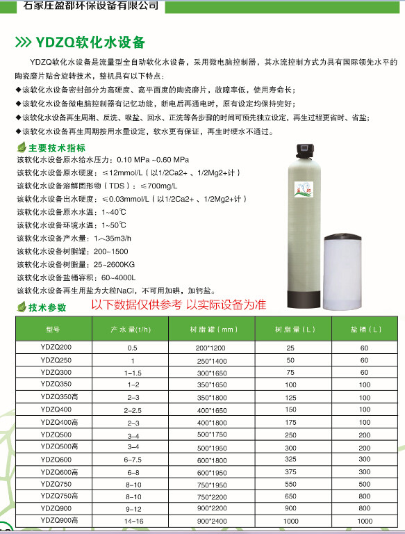 1、設備運行周期和進鹽量可根據(jù)原水硬度的高低選擇調(diào)整,樹脂用量少,耗鹽低,水質(zhì)優(yōu),操作簡單,維護方便.