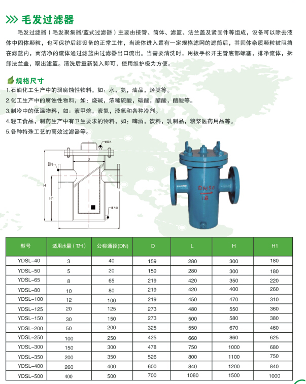 毛發(fā)過濾器在工作時,介質由進口進入濾網內側,經濾網過濾后進入濾網外側,經出口進入管路系統(tǒng)。當毛發(fā)聚集器使用一定時間后由于污物的堵塞書的阻力增大,這時就需要打開聚集器的封蓋,取出里面的濾筒清洗干凈,然后再繼續(xù)使用。