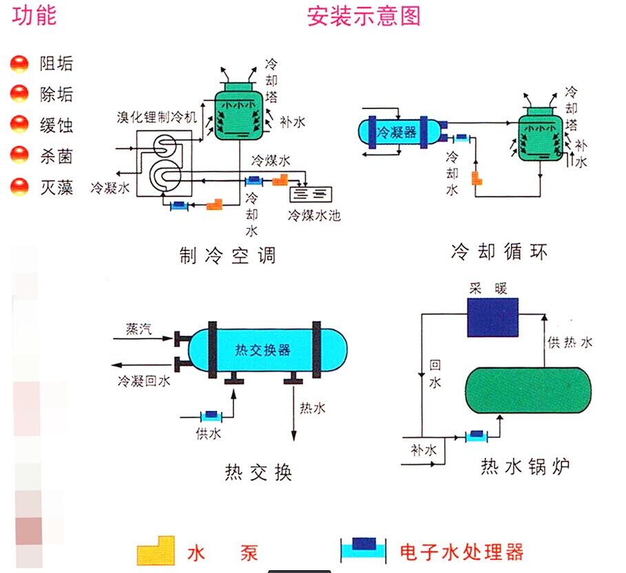 該設(shè)備具有防垢除垢、防腐阻銹、殺菌滅藻、活化水質(zhì)等功能。可廣泛應(yīng)用于中央空調(diào)系統(tǒng)、工業(yè)冷卻系統(tǒng)、熱交換系統(tǒng)、熱水鍋爐系統(tǒng)及其它各種用水設(shè)備系統(tǒng)。